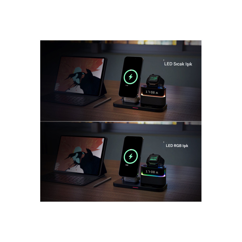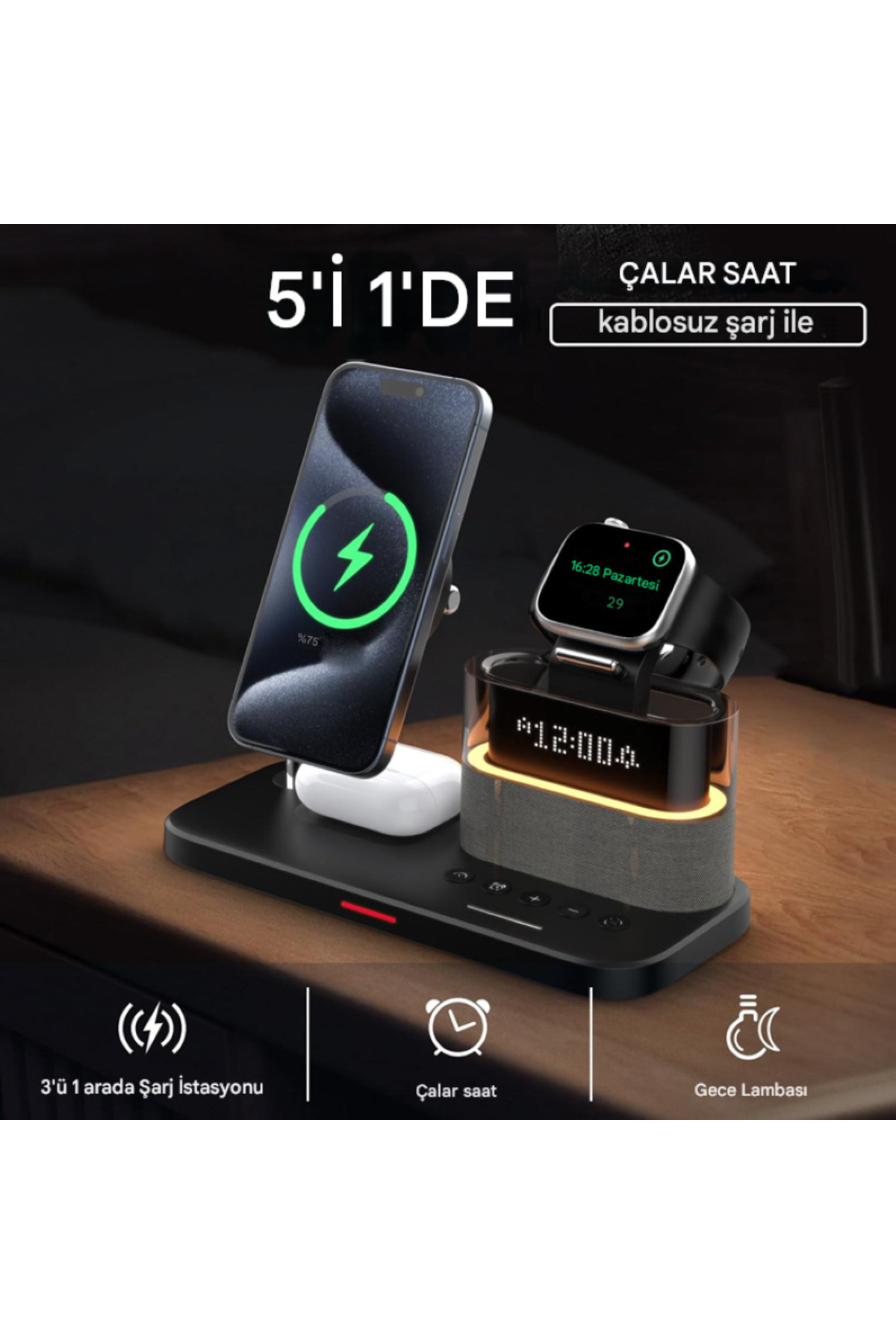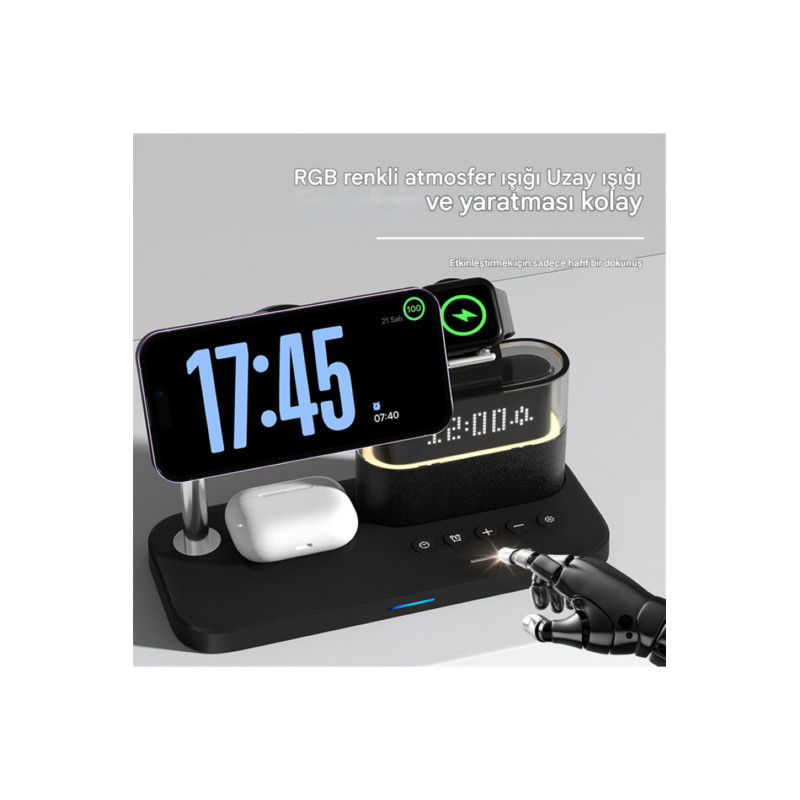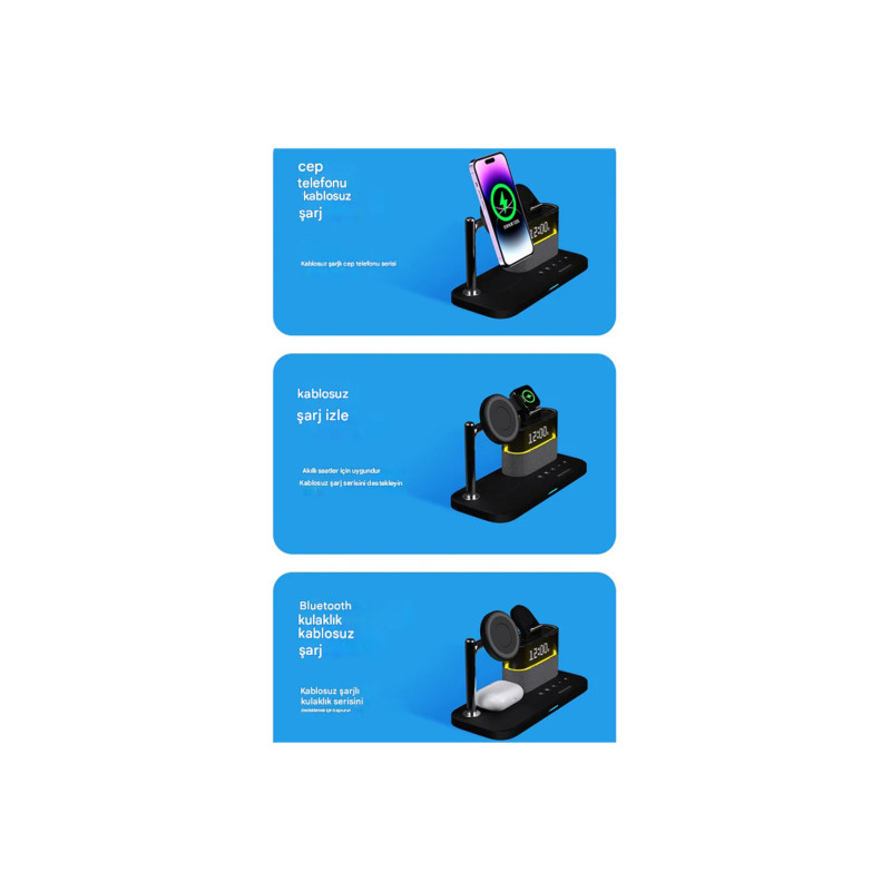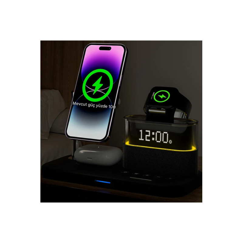 Bu inovatif cihaz, modern yaşamın tüm şarj ve zamanlama ihtiyaçlarını tek bir şık ve kompakt ünitede birleştirir. Komodin veya çalışma masanız için tasarlanmış bu ürün, 3 farklı cihazı aynı anda kablosuz şarj ederken, aynı zamanda dijital bir Çalar Saat ve ayarlanabilir bir LED Gece Lambası görevi görür. Kablo karmaşasına kesin bir son verin!