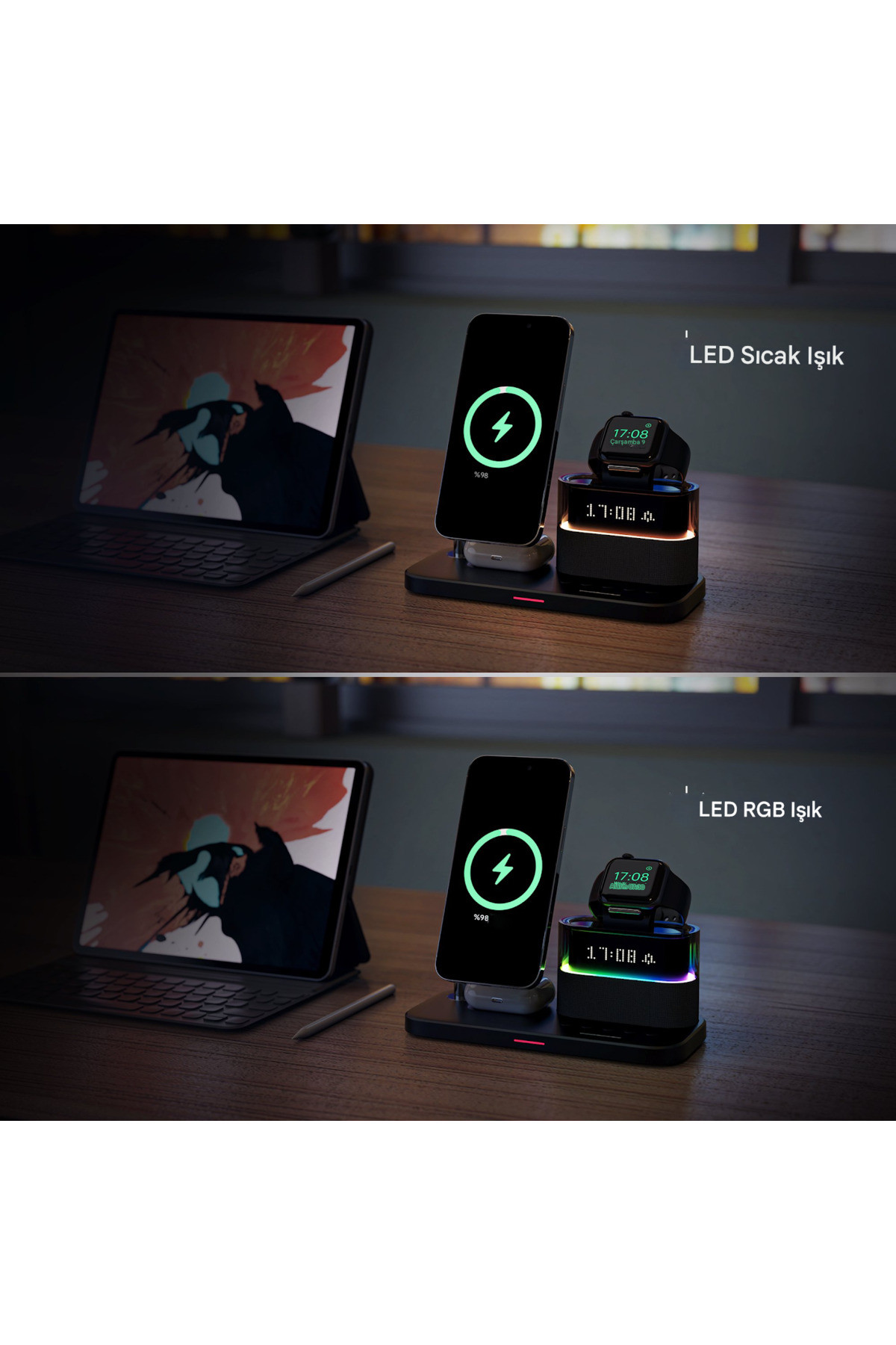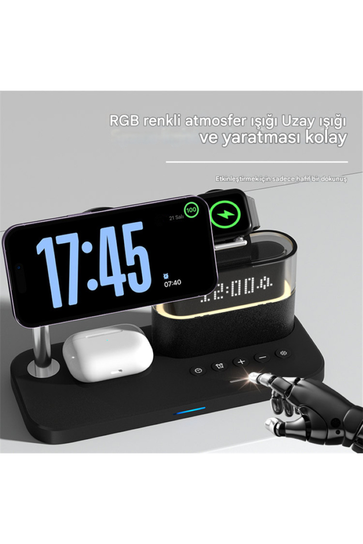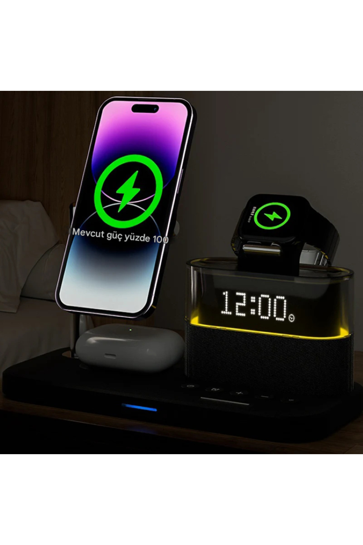 Bu inovatif cihaz, modern yaşamın tüm şarj ve zamanlama ihtiyaçlarını tek bir şık ve kompakt ünitede birleştirir. Komodin veya çalışma masanız için tasarlanmış bu ürün, 3 farklı cihazı aynı anda kablosuz şarj ederken, aynı zamanda dijital bir Çalar Saat ve ayarlanabilir bir LED Gece Lambası görevi görür. Kablo karmaşasına kesin bir son verin!