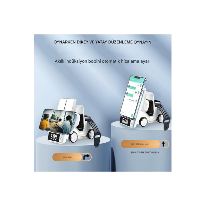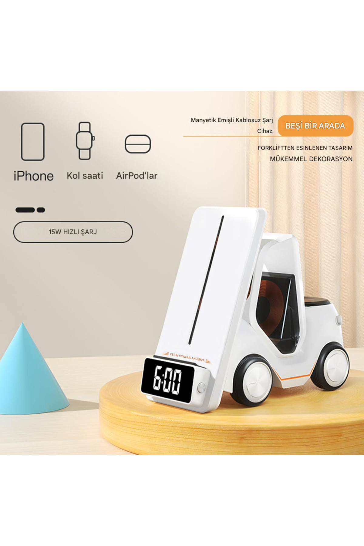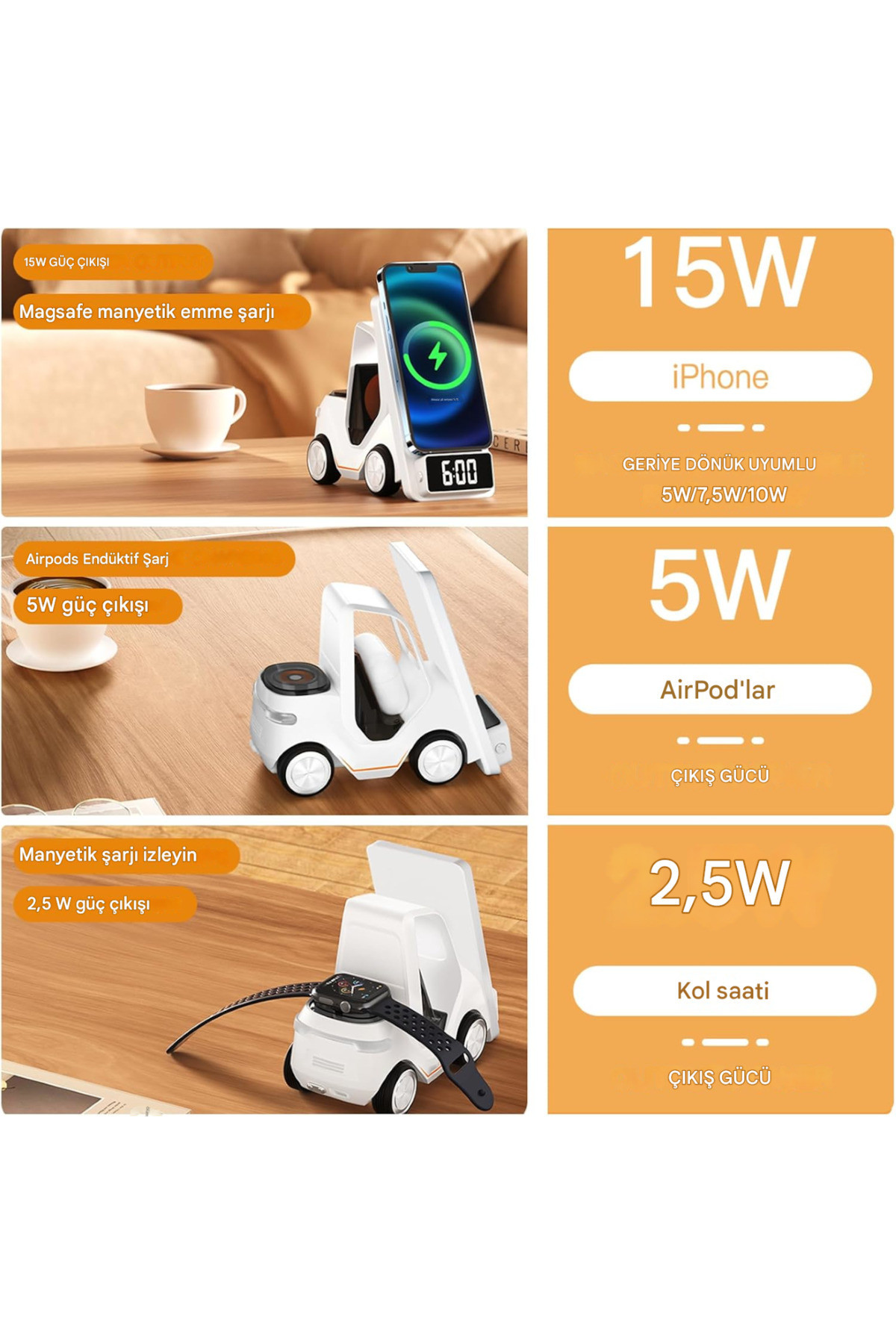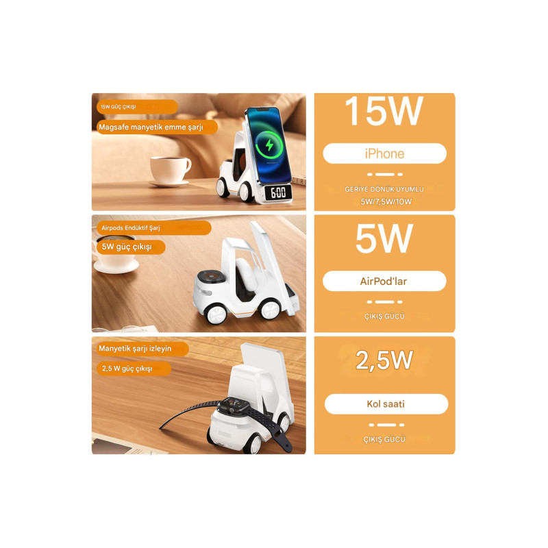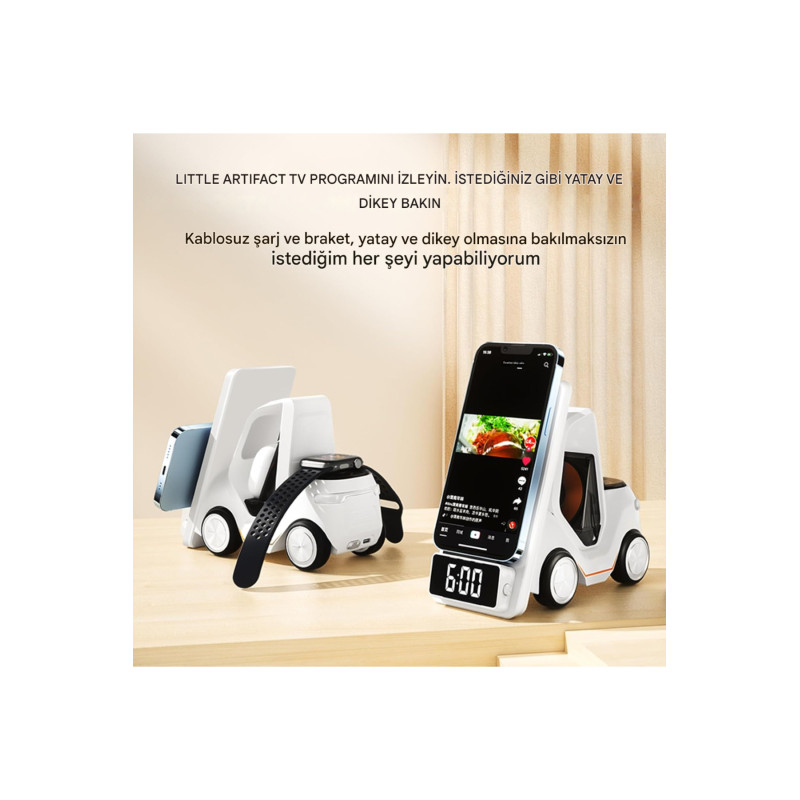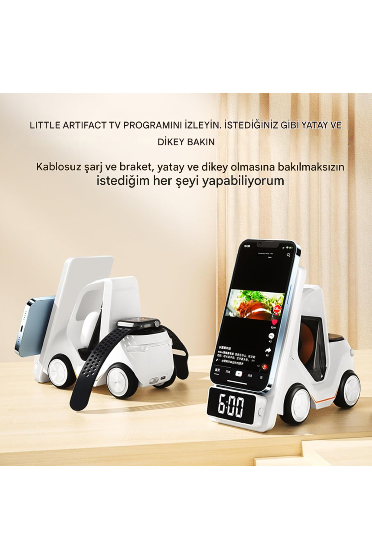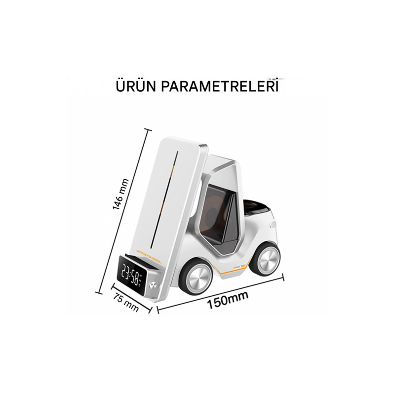 Dağınıklığa son verin ve şarj deneyiminizi bir üst seviyeye taşıyın! Sevimli ve kompakt bir forklift/araba tasarımıyla cihazlarınızı şarj ederken masaüstünüzü düzenli hale getiren çok fonksiyonlu kablosuz şarj cihazıdır.