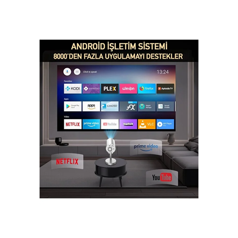 Evinizin konforunda veya dilediğiniz her yerde film keyfi yaşayın. Şık, silindir tasarımlı ve kompakt yapısıyla bu Android taşınabilir projeksiyon, sinema deneyimini cebinize sığdırıyor.