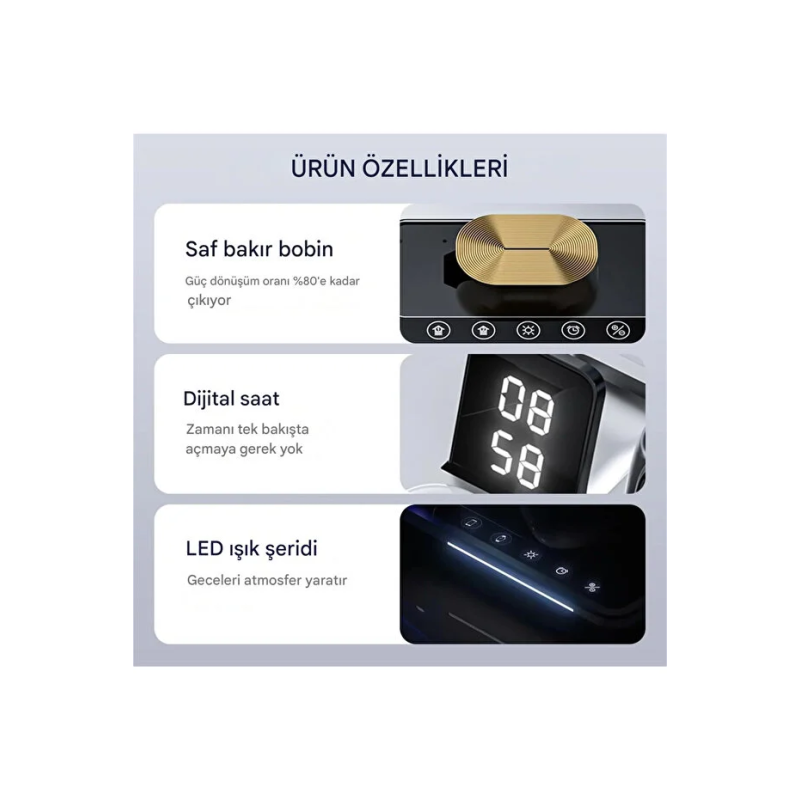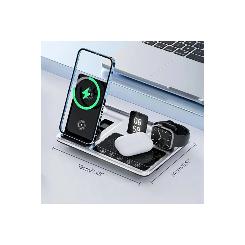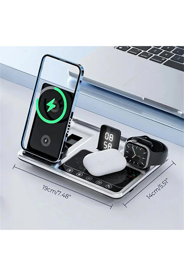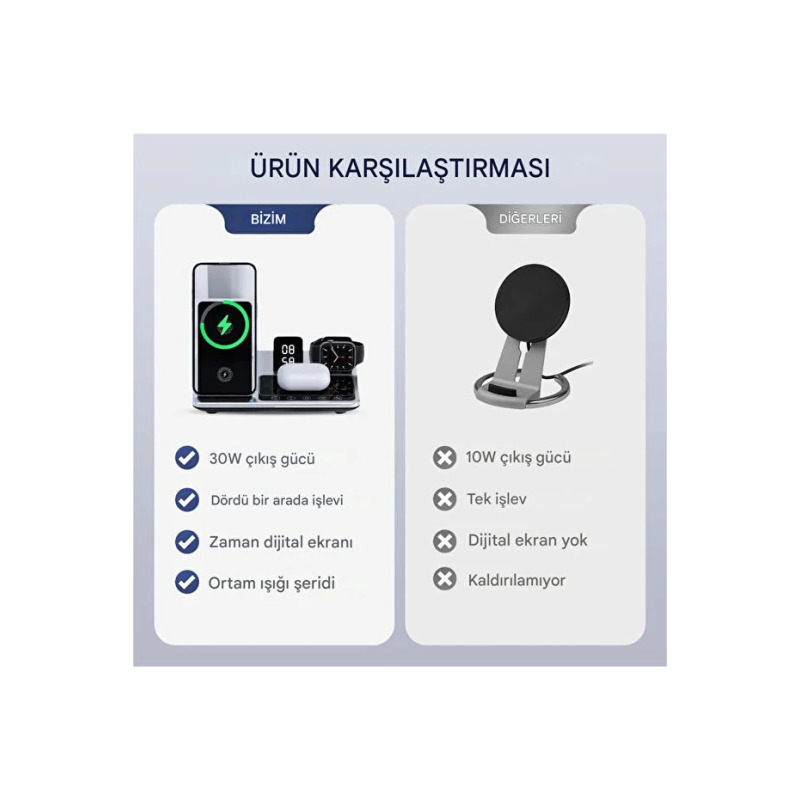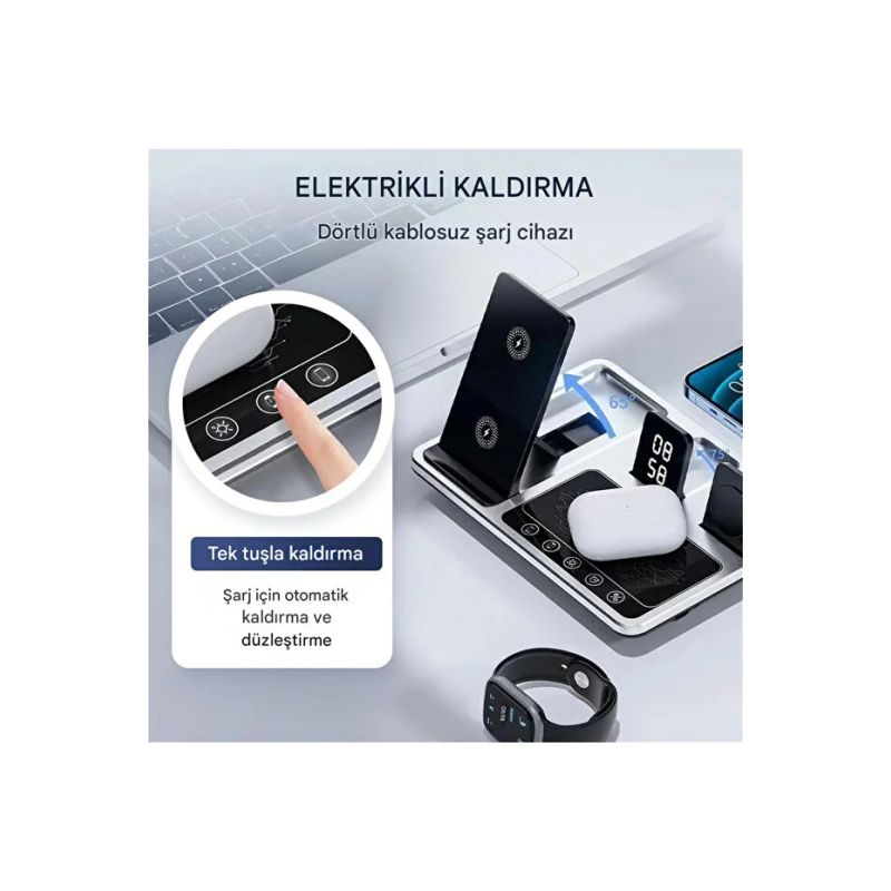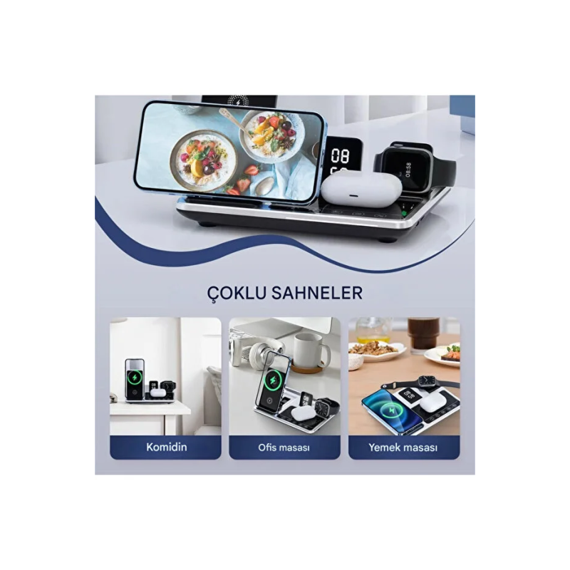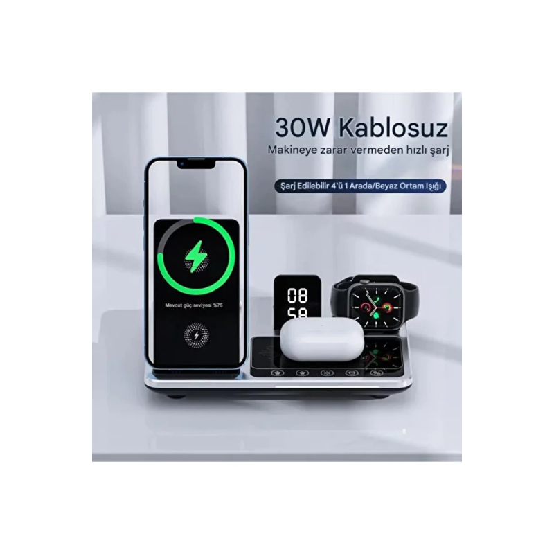Çoklu Şarj: Telefon, akıllı saat, kablosuz kulaklık ve ek bir cihazı aynı anda şarj edebilen 4'ü bir arada işlev sunar.