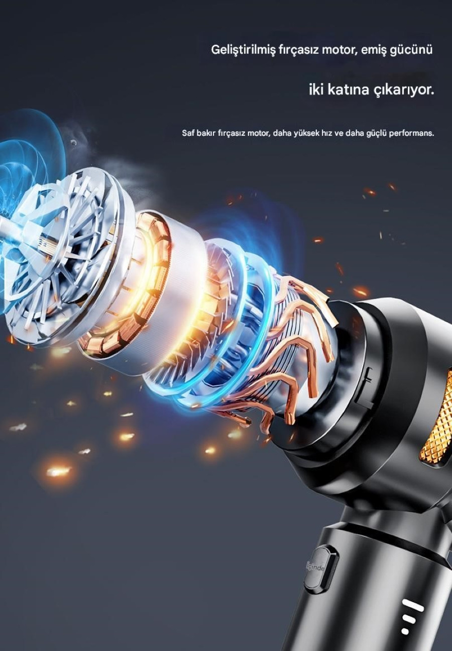 Yeni Nesil Fırçasız (Brushless) Motor: Saf bakır sargılı motor teknolojisi sayesinde sürtünmeyi azaltır, daha az ısınır ve 2 kat daha fazla sunar.