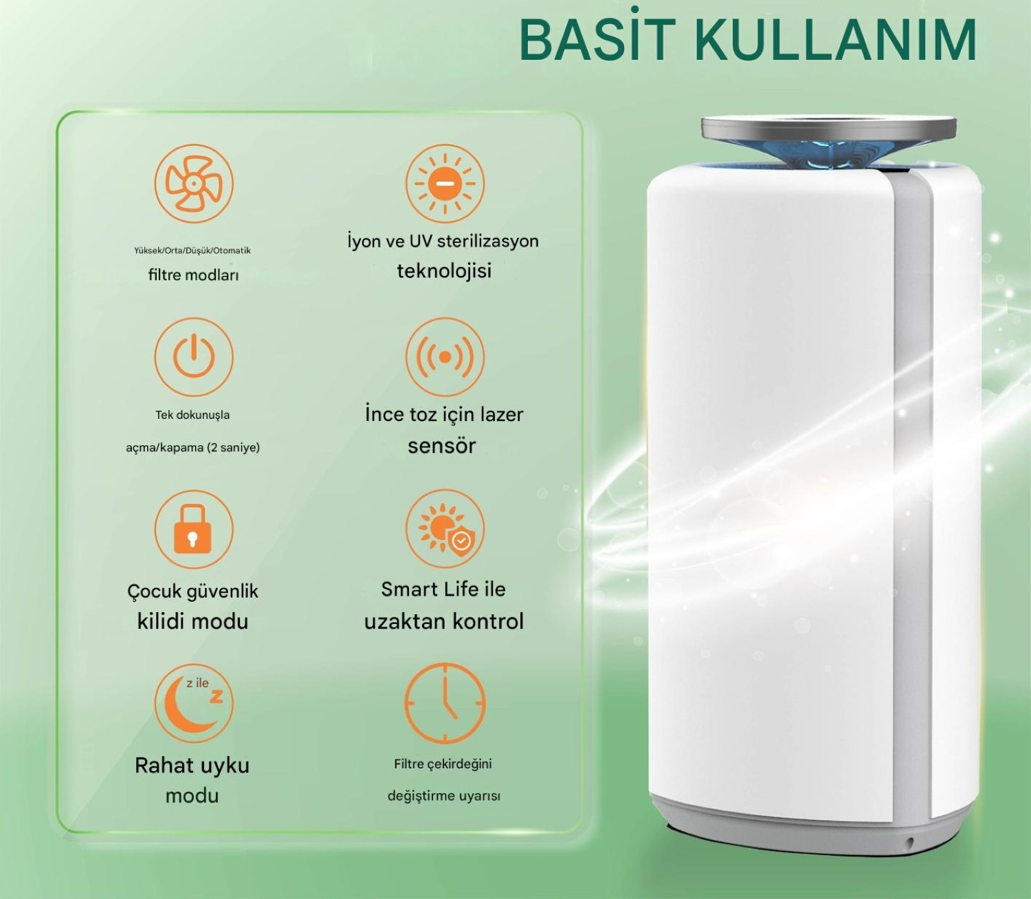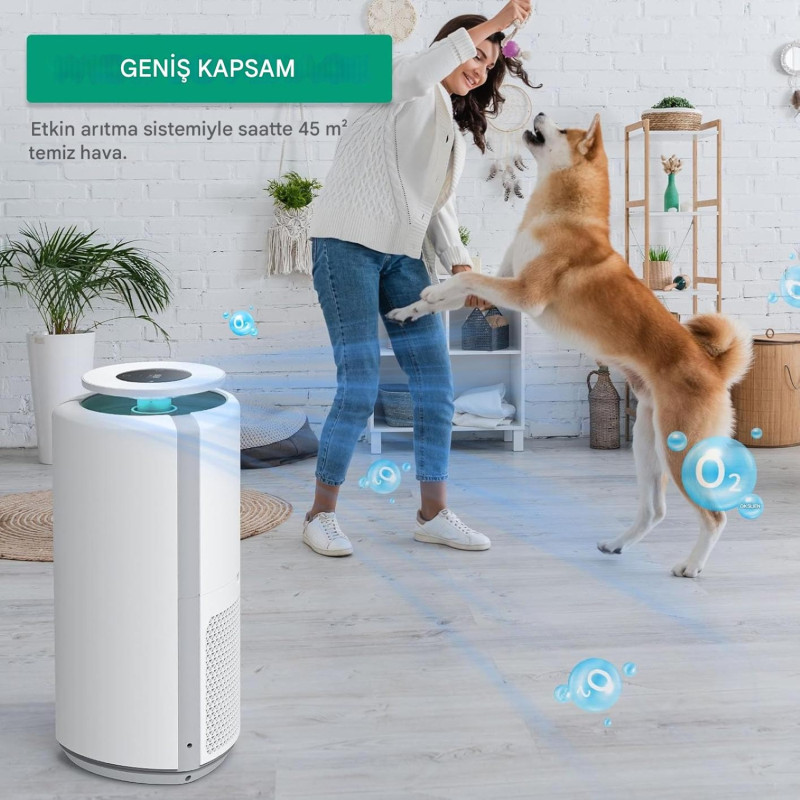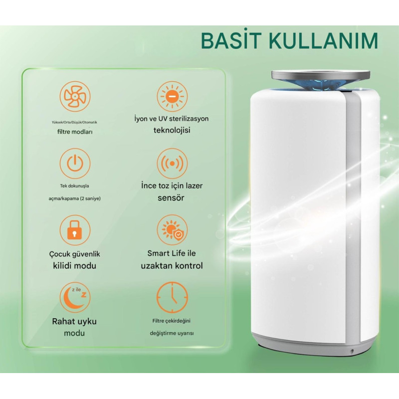 Wi-Fi ve Mobil Uygulama (Smart Life): Telefonunuz üzerinden aç/kapa yapabilir, mod değiştirebilir, hava kalitesini anlık olarak görebilir ve filtre ömrünü takip edebilirsiniz.