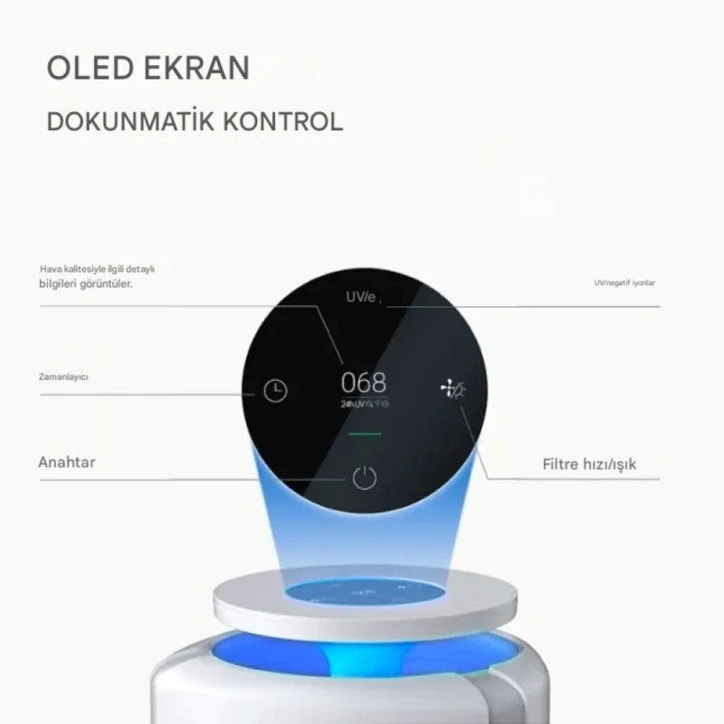 OLED Dokunmatik Ekran: Cihazın üzerindeki şık siyah ekran, PM2.5 değerini (hava kirlilik oranını) sayısal olarak gösterir.