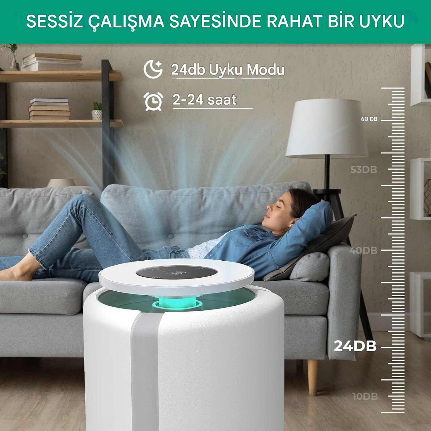 Görsellerde özellikle vurgulanan "Rahat Bir Uyku" özelliği, cihazın yatak odası için ideal olduğunu gösteriyor.