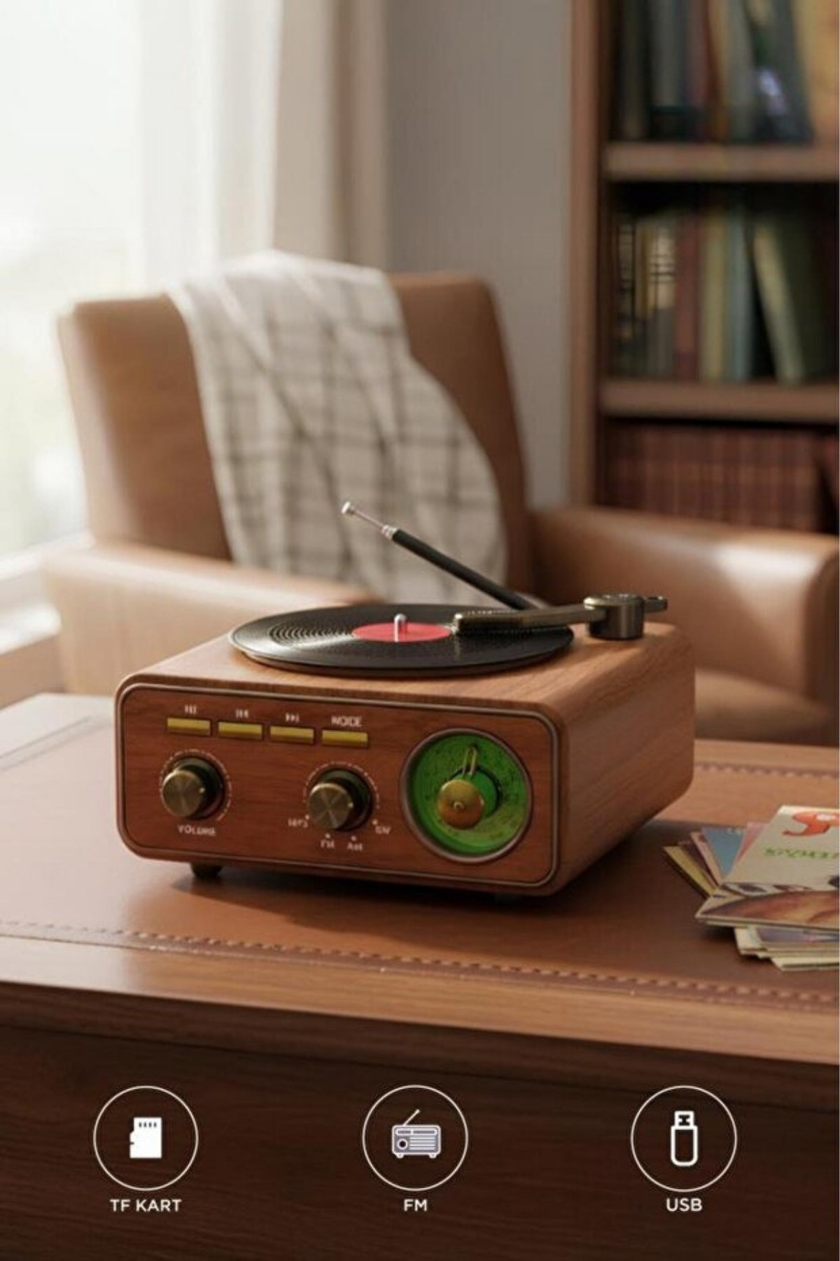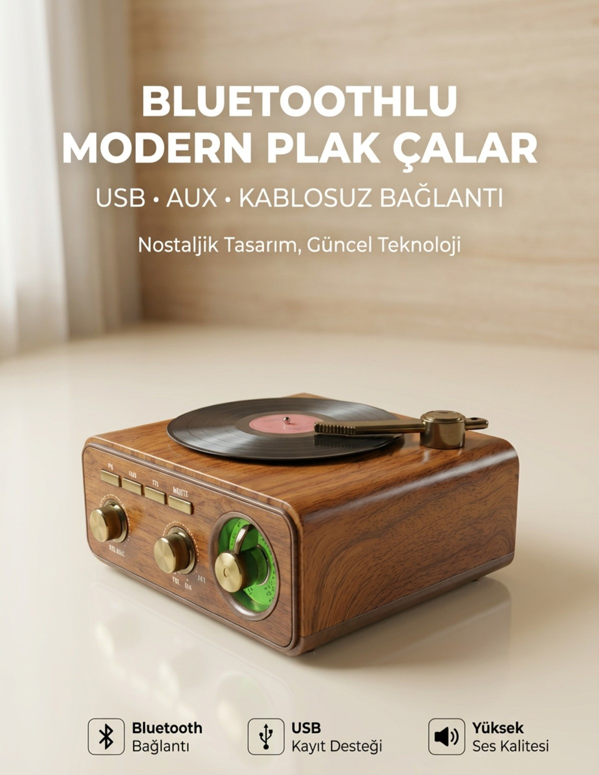 Dekoratif Obje: Şık gramofon borusu ve gold detaylarıyla salonunuzun en çok dikkat çeken parçası olacak.