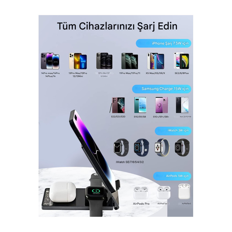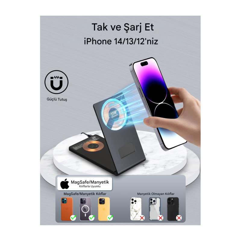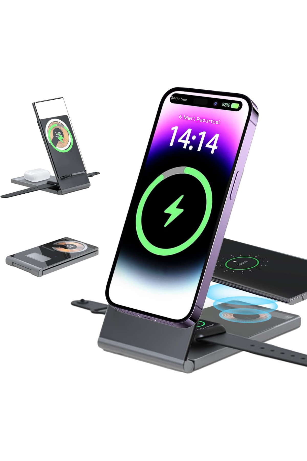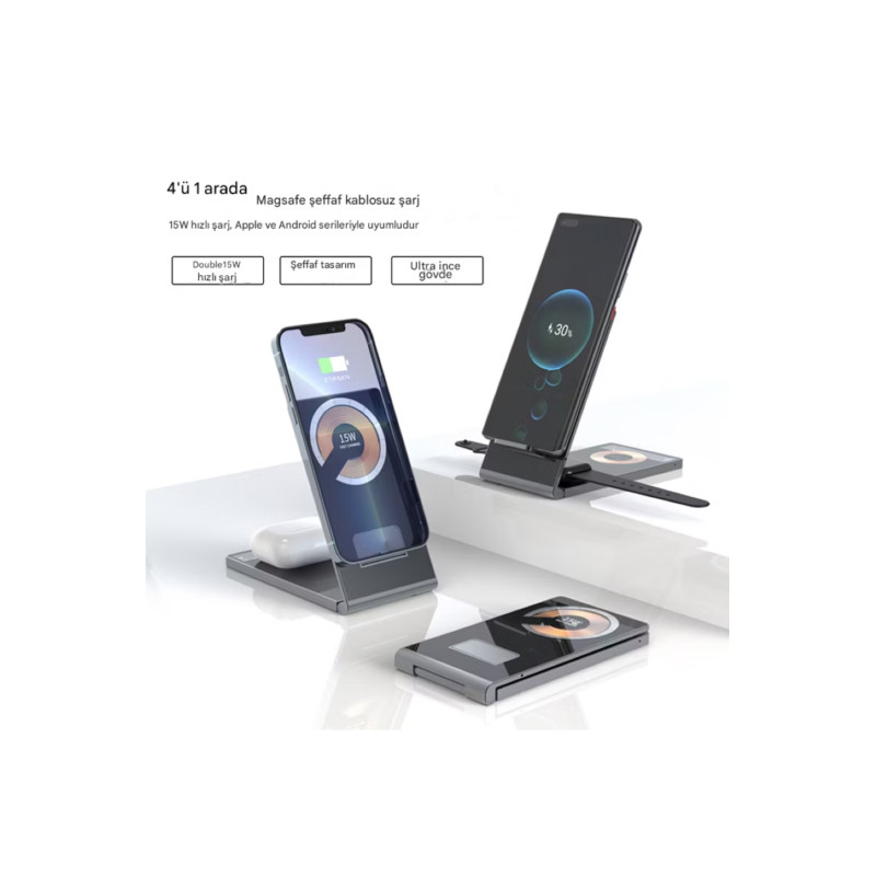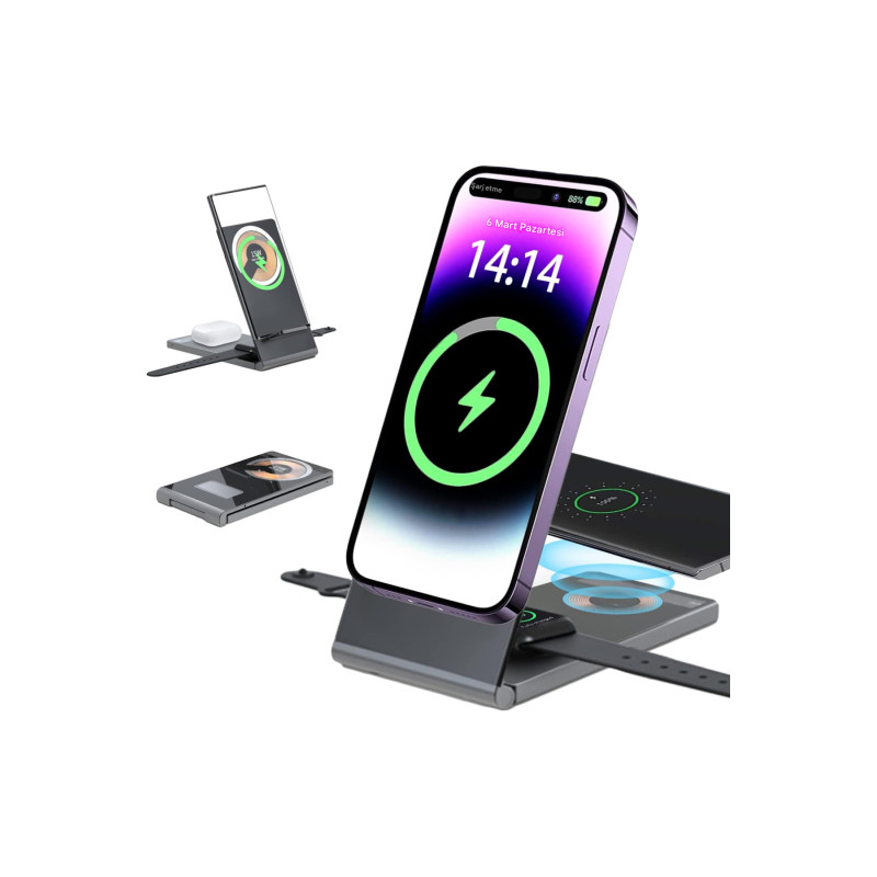 Masanızdaki ve çantanızdaki kablo dağınıklığından kurtulun! Telefonunuzu, akıllı saatinizi ve kablosuz kulaklığınızı aynı anda, tek bir şık stant üzerinde şarj edin. Katlanabilir yapısı sayesinde ister ofiste kullanın, ister seyahatte yanınızda taşıyın.