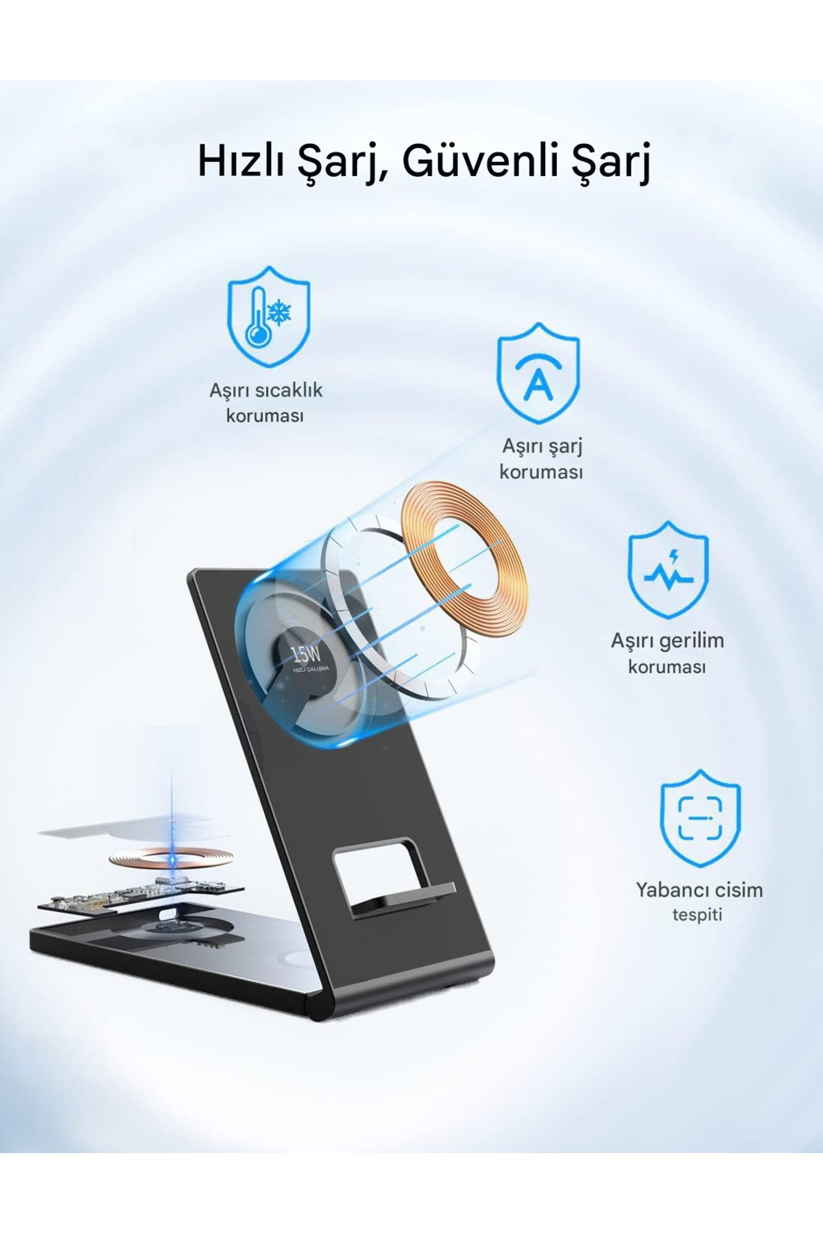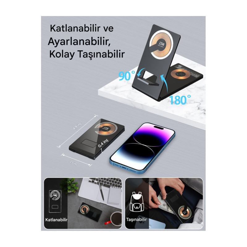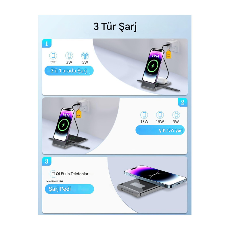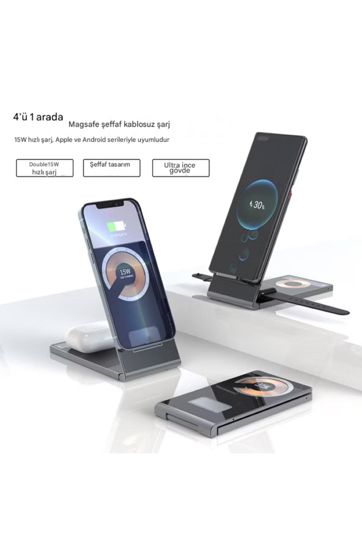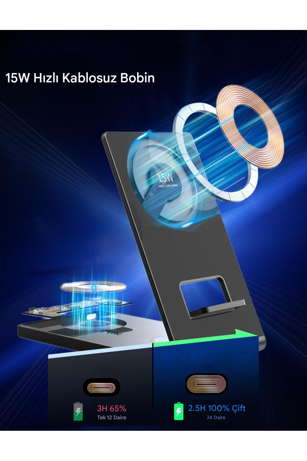 Masanızdaki ve çantanızdaki kablo dağınıklığından kurtulun! Telefonunuzu, akıllı saatinizi ve kablosuz kulaklığınızı aynı anda, tek bir şık stant üzerinde şarj edin. Katlanabilir yapısı sayesinde ister ofiste kullanın, ister seyahatte yanınızda taşıyın.